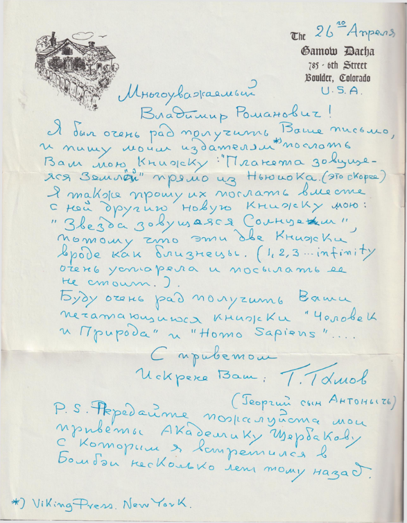 Это письмо было вложено в книгу Гамова “A Star Called the Sun”.