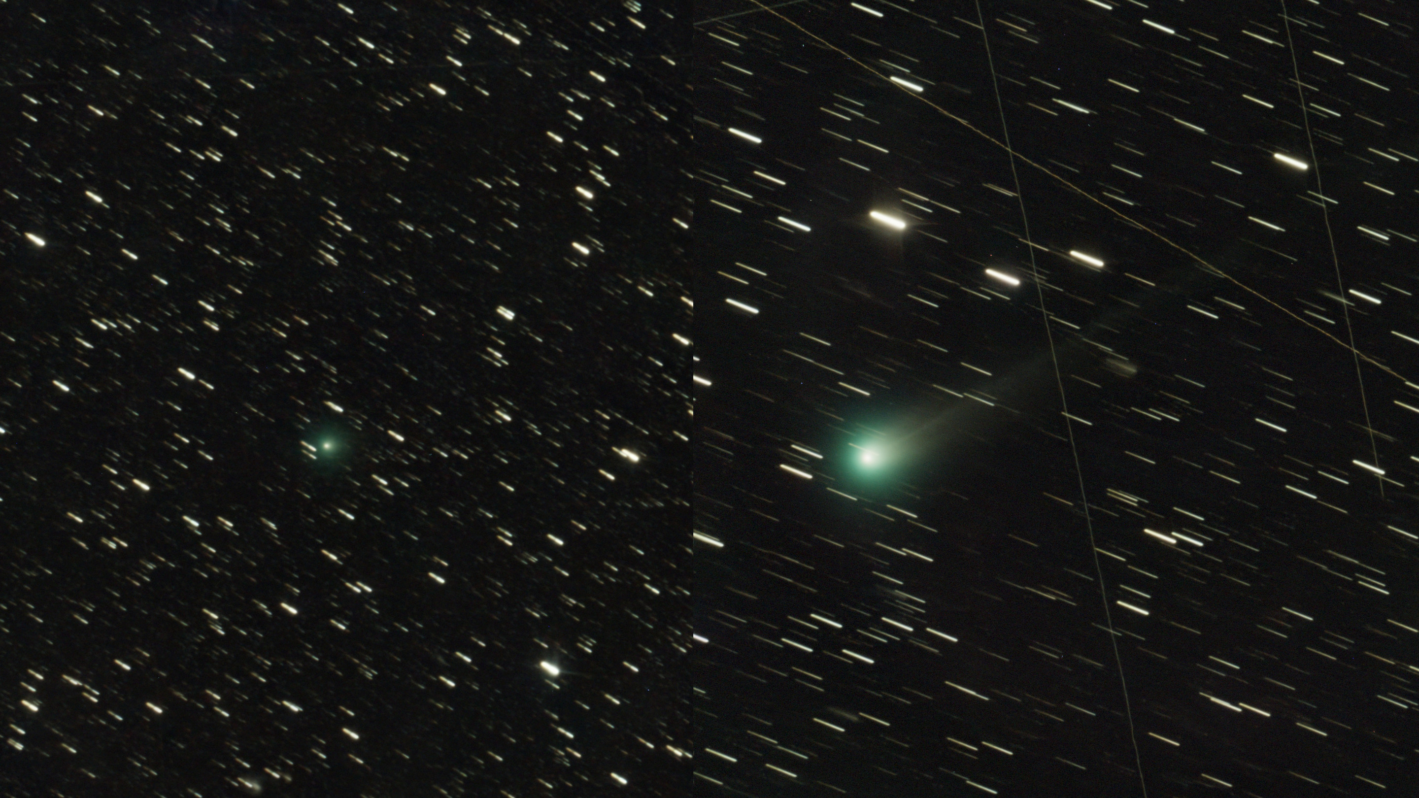 В завершение ночи я решил снять еще одну, совсем малоизвестную на тот момент комету С/2025 А6 (Lemmon). Располагалась она в созвездии Близнецов. Относительно яркая, около 11-й звездной величины. Но на снимках это было довольно унылое зеленое пятно. Чтобы понять, что перед нами одна из главных комет года, нужно было пронаблюдать ее еще раз, уже в октябре. За это время комета переместилась из Близнецов в созвездие Рыси, ее голова стала намного ярче, и, конечно же, впечатляет отросший тонкий ионный хвост. Разница между фотографиями колоссальная.