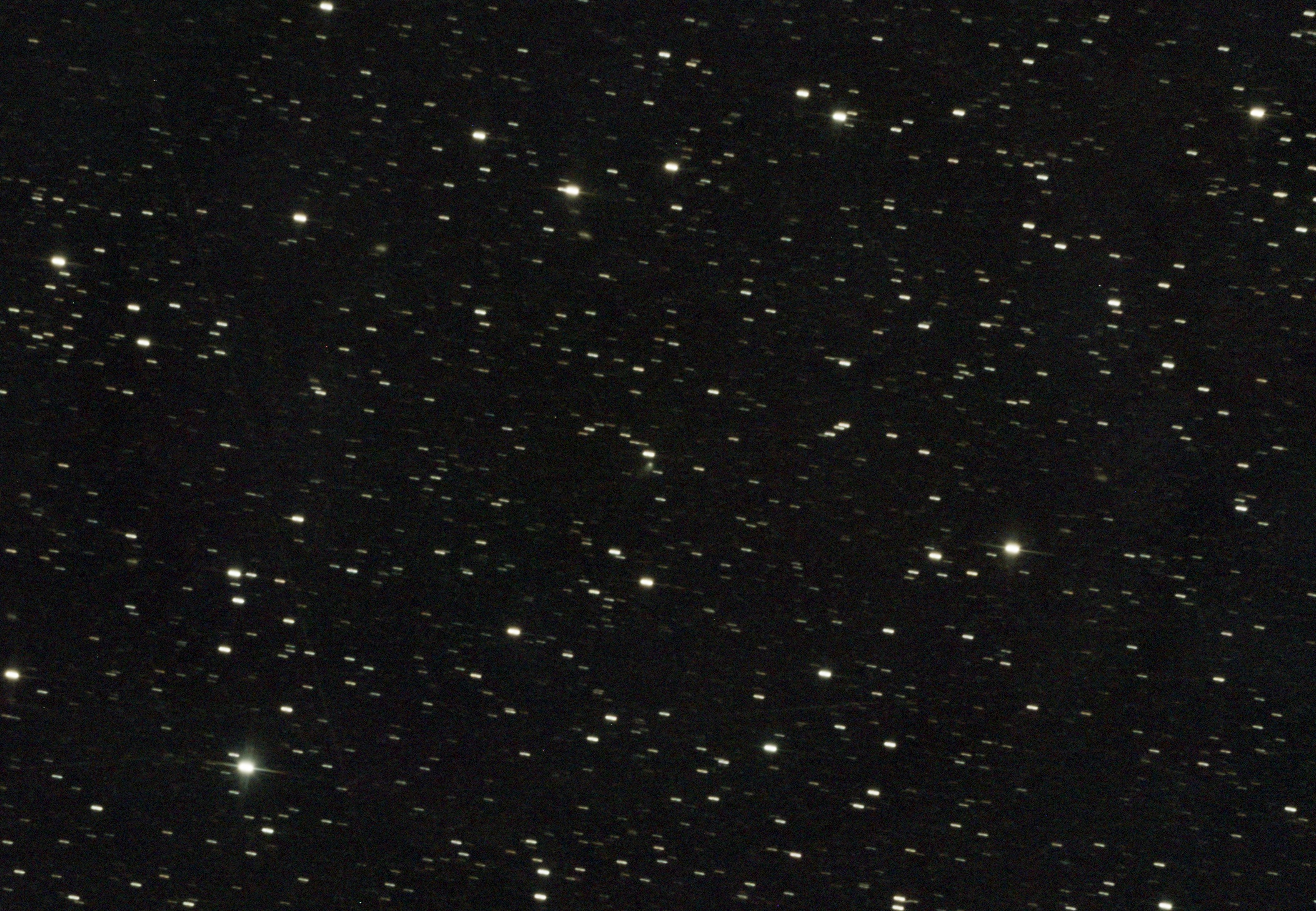 Съемку я также проводил в течение часа, и на снимке видно, как комета перемещалась по небу за это время. Тут, конечно, никаких сомнений в ее природе нет, отлично виден пылевой хвост. Фотография получена сложением 60 одноминутных кадров.