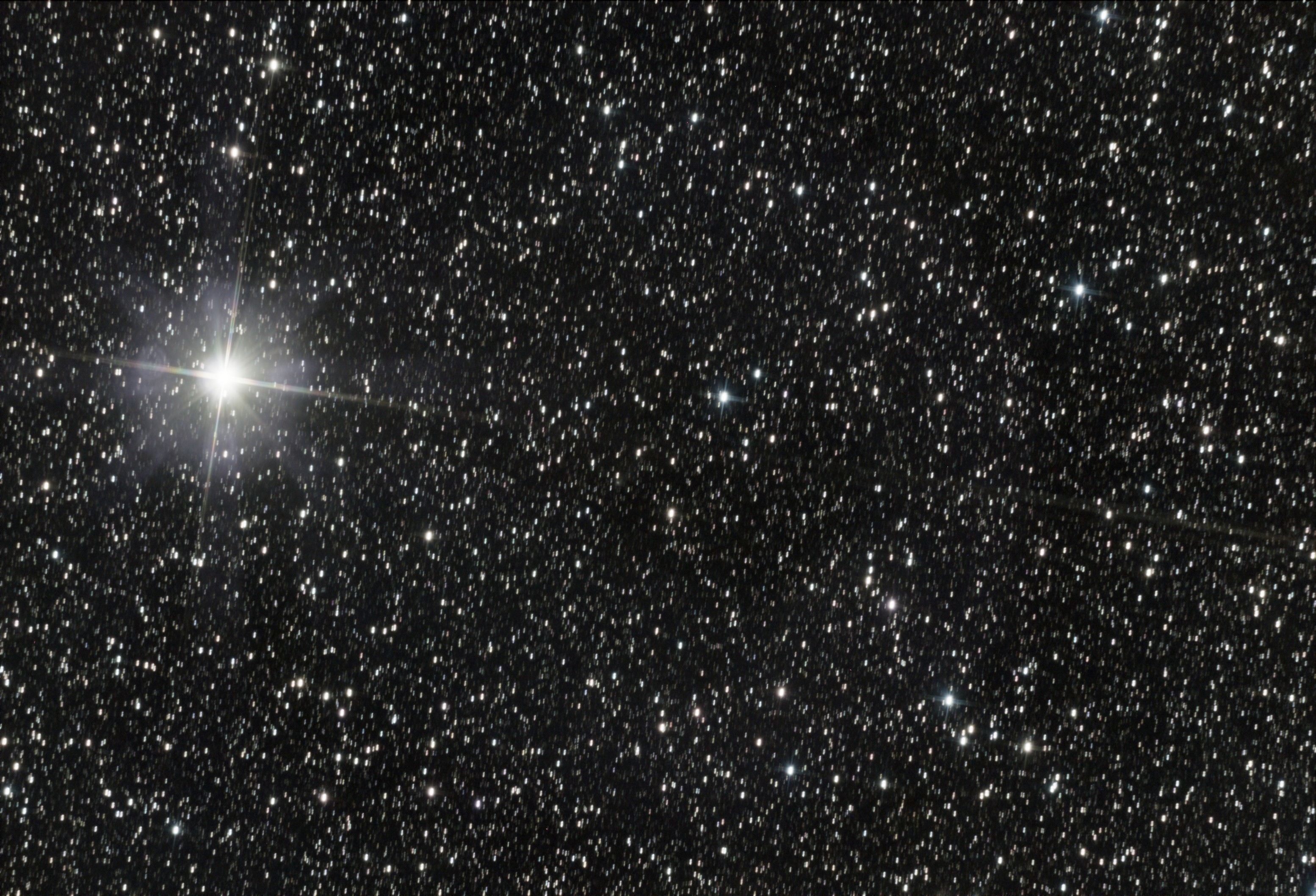 Следующей моей «жертвой» оказалась еще одна комета, найденная системой ATLAS, третья за ночь — С/2022 Е2. Располагалась она очень удобно для наблюдений, рядом с самой яркой звездой в созвездии Кассиопеи — Шедар. Правда, комета очень тусклая — порядка 15-й звездной величины. Но после сложения тридцати одноминутных кадров ее удалось поймать. Яркая звезда на снимке — Шедар, Альфа Кассиопеи, а туманное пятнышко — комета С/2022 Е2 ATLAS.