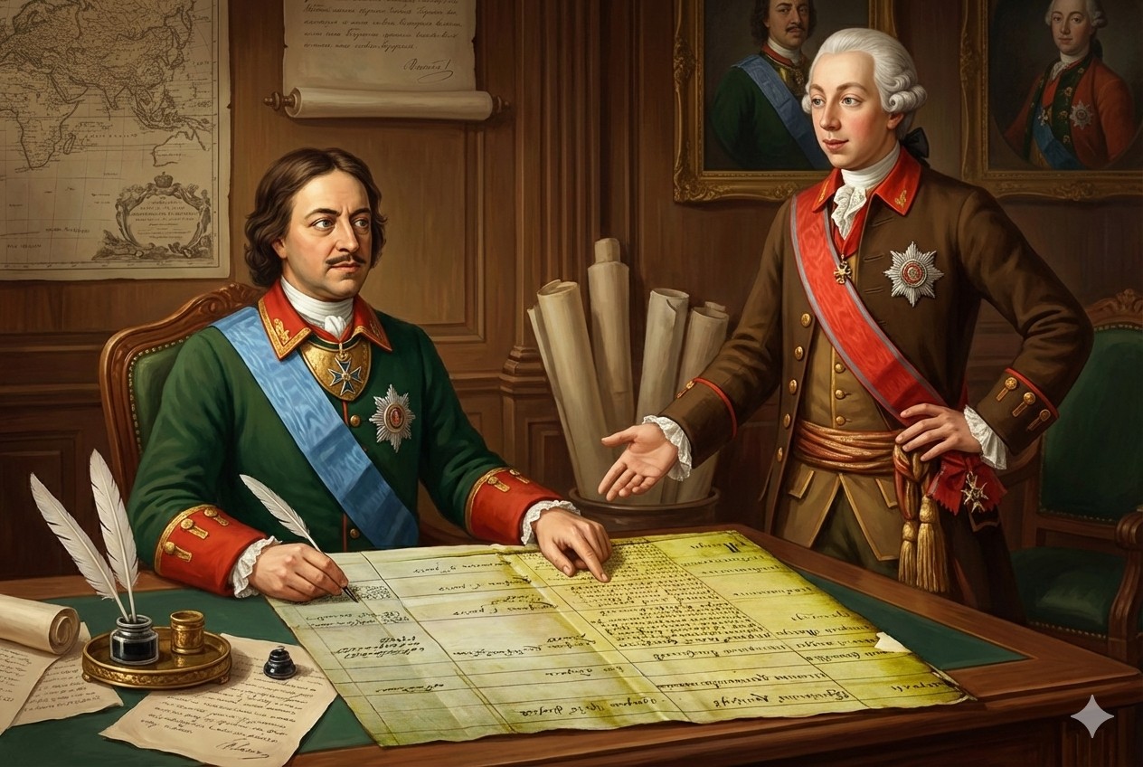 В эти дни мы традиционно вспоминаем важнейшую веху в истории России — отмену крепостного права и освобождение крестьян. 165 лет назад, 3 марта (19 февраля по старому стилю) 1861 года, император Александр II подписал «Манифест об отмене крепостного права», освободивший более 23 млн крестьян от личной зависимости. Крестьяне получили гражданские права, но земля оставалась собственностью помещиков до выкупа, временнообязанные крестьяне продолжали нести повинности. Это ключевая «Великая реформа». Однако историческая ирония заключается в том, что освобождению крестьян предшествовал другой, не менее сложный и долгий процесс — освобождение самих помещиков. Прежде, чем стать по-настоящему привилегированным и свободным классом, русское дворянство было жестко «закабалено» государством при Петре I. И лишь спустя десятилетия, благодаря одному из «внезапных» и многими историками недооцененных решений Петра III, высшее сословие получило долгожданную личную свободу. Вспомним кратко историю двух эпохальных документов — петровской «Табели о рангах» и «Манифеста о вольности дворянства», — чтобы проследить тот прихотливый путь, что проделывала Россия.