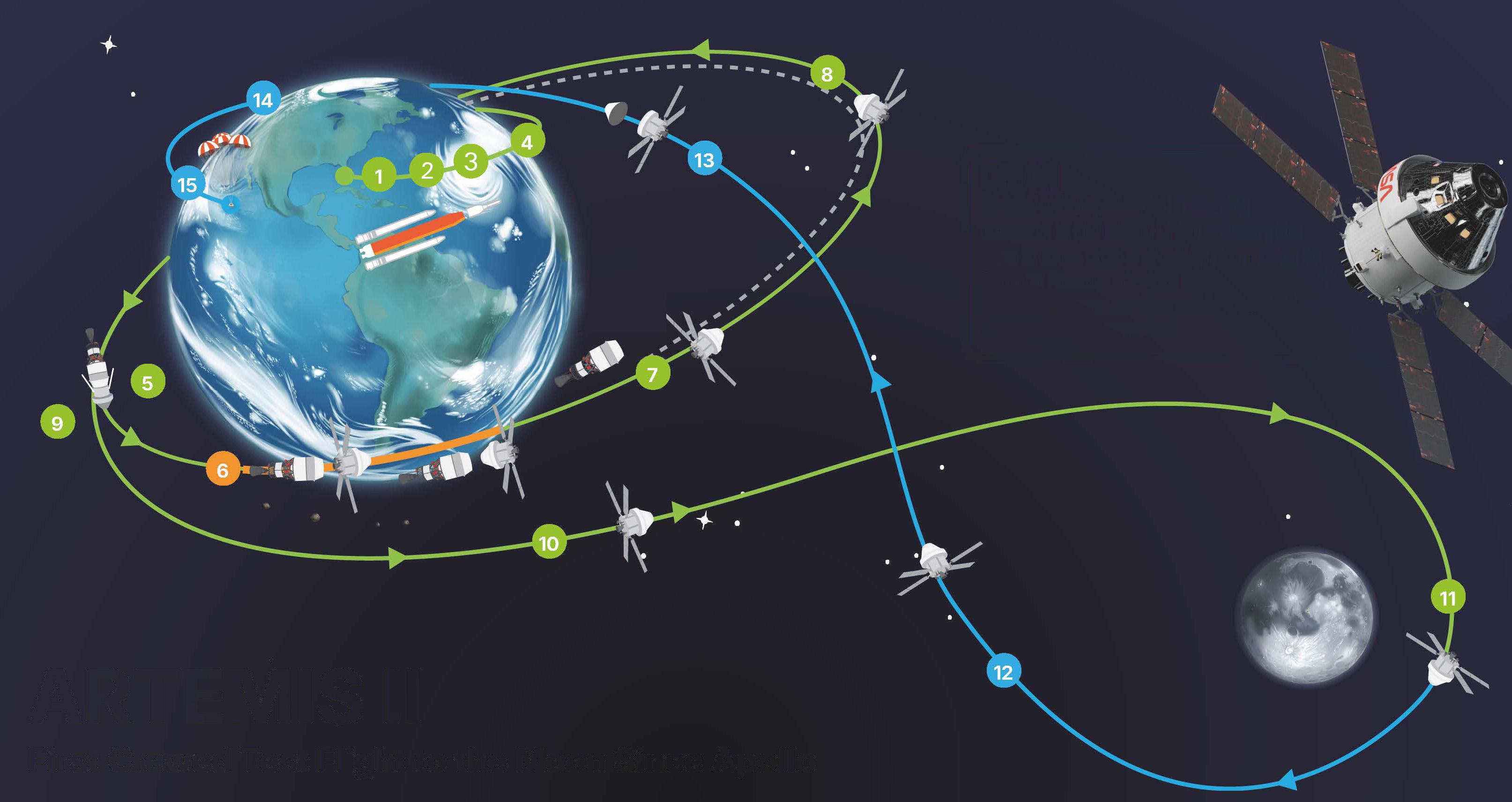 В 2022 году корабль «Орион» миссии «Артемида-1» был сразу направлен к Луне. В этот раз траектория полета предусматривала один виток по высокоэллиптической околоземной орбите для тестов всех основных систем до отлета от Земли. Если бы в ходе испытаний были обнаружены серьезные неполадки, то полет «Артемиды-2» прервали бы и командный модуль с экипажем вернулся бы обратно.