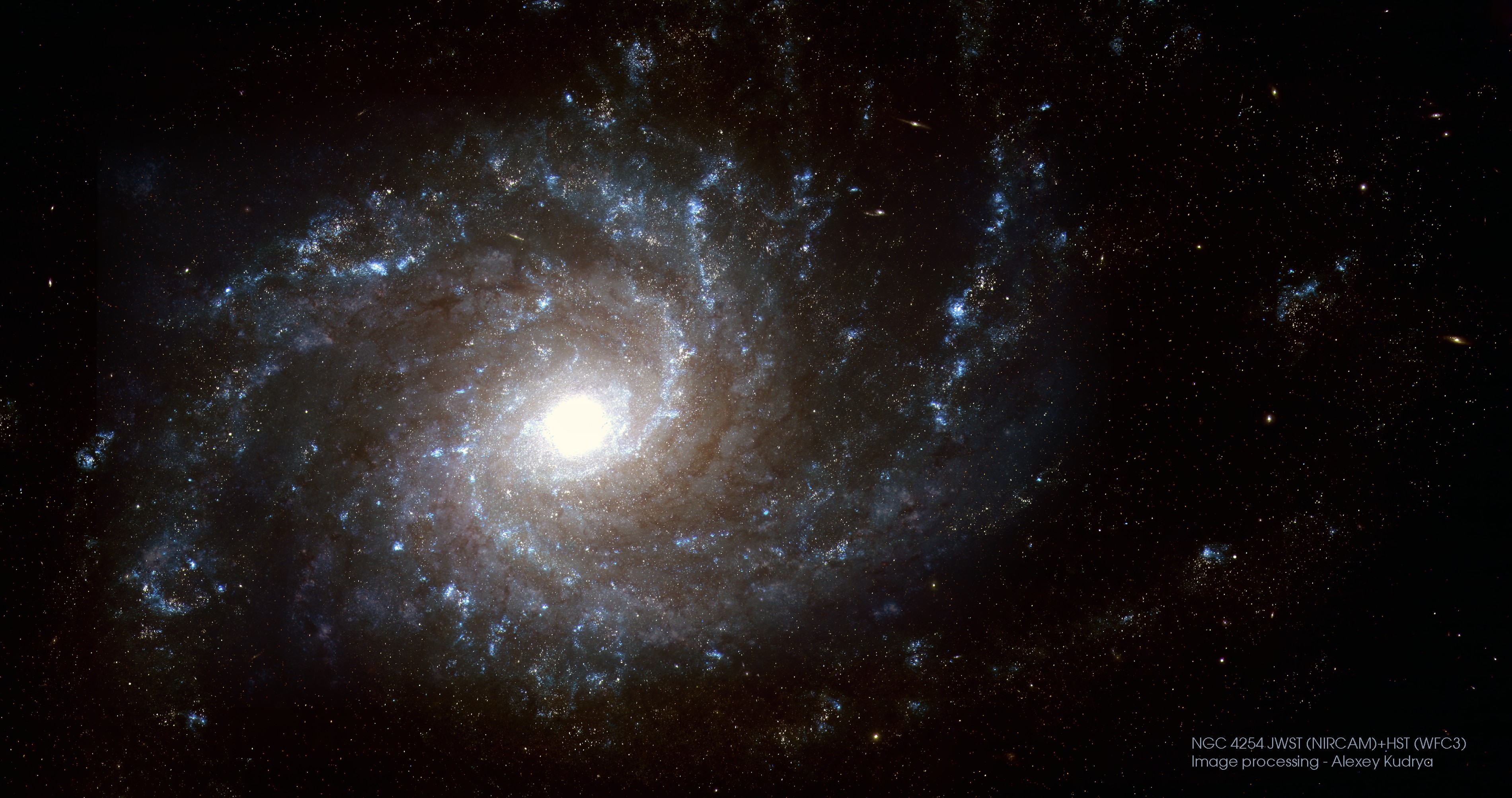 Изображение номера — величественная спираль NGC 4254, которую также называют M99 или Колесо святой Екатерины (St. Catherine’s Wheel). Она расположена в созвездии Волосы Вероники (Coma Berenices) на расстоянии примерно 45–50 млн световых лет от нас и входит в скопление Девы (Virgo Cluster), одно из самых близких к нам скоплений галактик. Эта галактика была обнаружена 15 марта 1781 года французским астрономом Пьером Мешеном. Позже Шарль Мессье включил ее в свой каталог как объект 99. NGC 4254 характеризуется двумя четко очерченными рукавами и классифицируется как SA(s)c (спираль без перемычки с незамкнутыми рукавами). Ее видимый диаметр — примерно 100 тыс. световых лет, что сравнимо с Млечным Путем. Также у NGC 4254 заметно смещен центр, что, как полагают ученые, является результатом гравитационного взаимодействия с другой галактикой около 280 млн лет назад. В центре NGC 4254 находится сверхмассивная черная дыра, что позволяет характеризовать ее как галактику с активным ядром (AGN).