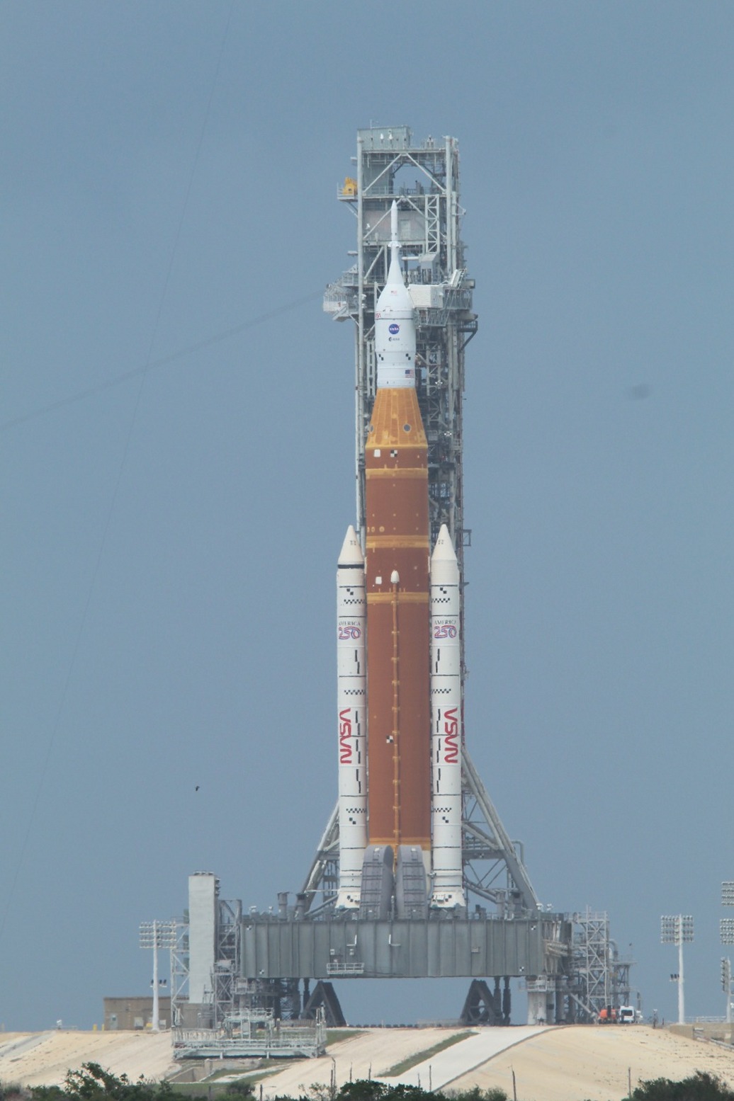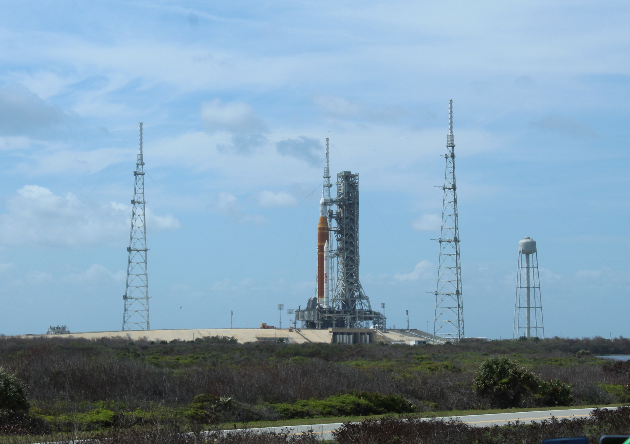 Два часа до запуска пролетают быстро. Возникают проблемы с батареями в спасательной башне, и одну из них заменяют. Прямая трансляция на гигантском экране хорошо это объясняет. Тем временем вечернее солнце скрывается за облаками на западе. Ракета SLS светится бело-оранжевым на горизонте, а окружающая растительность зеленеет. Лунная ракета теперь залита солнечным светом, в то время как у нас уже тень.
