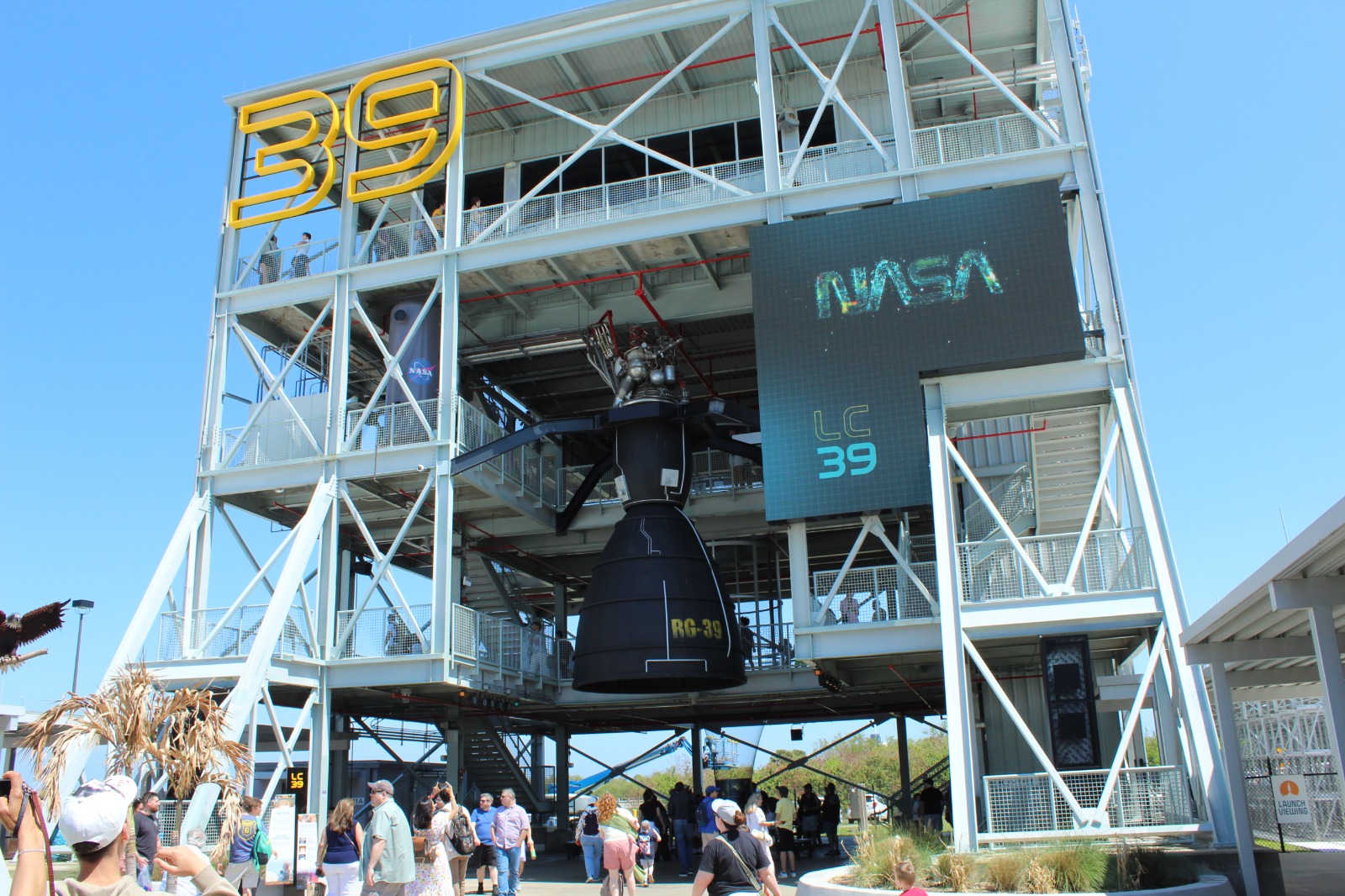 Автобус высадил нас на новой площадке под названием “Launch Complex 39 Observation Gantry” 6. Это четырехэтажный стальной каркас в форме испытательного стенда, на котором установлен макет двигателя из Космического центра имени Джона Стенниса, и сам стенд расположен напротив дороги для гусеничного транспорта между стартовыми площадками LC39A и 39B. Отсюда открывается прекрасный вид на обе стартовые площадки. Справа — SpaceX с ракетой Falcon 9 и строящейся «Мехазиллой» для Starship (примерно в 2 км), слева — оранжево-белая ракета SLS миссии Artemis II (примерно в 3 км).