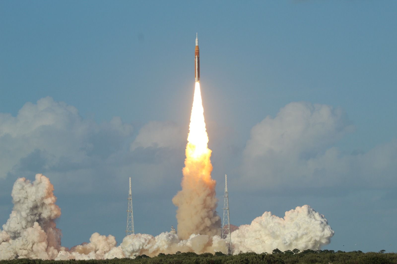 Косма: Напряжение нарастает по мере того, как обратный отсчет продолжается — семь минут, шесть, четыре… Менее чем за две минуты до старта все взгляды обращены к SLS. Мы знаем, что обратный отсчет на экранах немного задерживается, поэтому полностью сосредотачиваемся на ракете. Я не помню точные последние секунды обратного отсчета, но помню момент, когда на горизонте внезапно образовались белые клубы дыма, появился яркий свет, и ракета начала движение.
