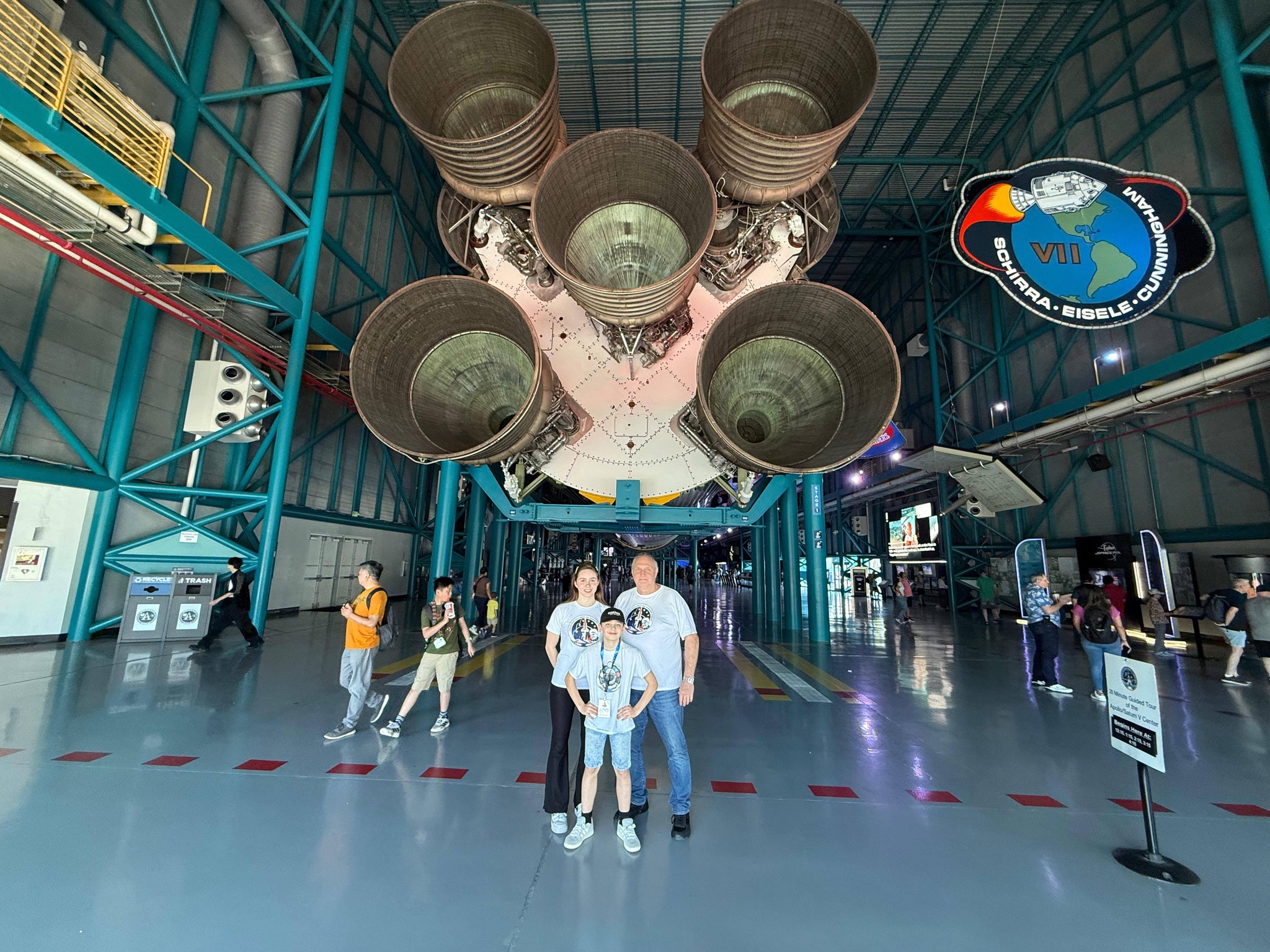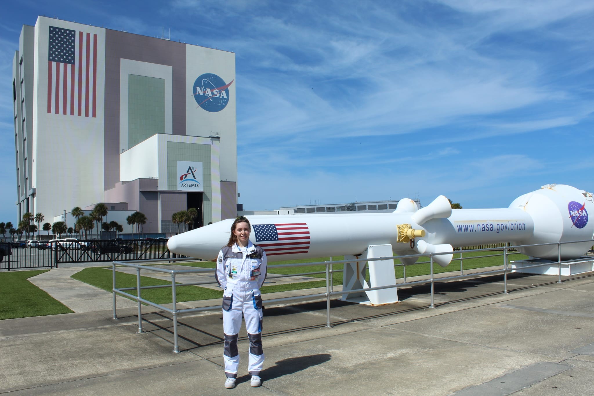 Мы также побывали в здании вертикальной сборки (VAB) — самом большом в мире по объему. Огромные ворота, большой логотип NASA справа и гигантский американский флаг слева. Внутри огороженной территории, где нам разрешили гулять, на земле был напечатан фрагмент этого флага, чтобы показать его масштаб. Красные и белые полосы были настолько широкими, что даже наш автобус мог бы по ним проехать.