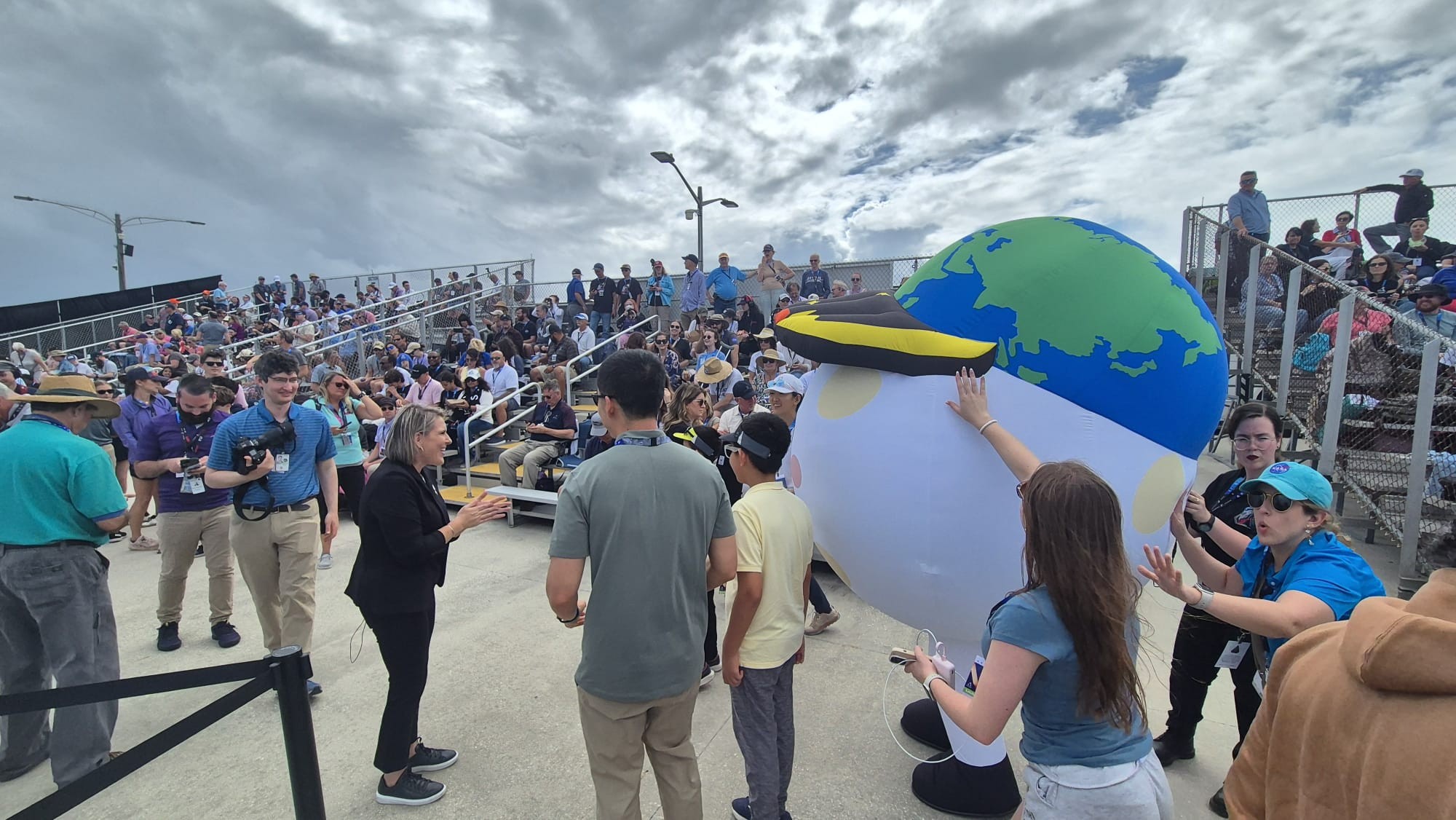 Косма: Мы прибыли в 10:45 утра с четкой целью: зарегистрироваться и получить бейджи для наблюдения за запуском Artemis II. Поэтому мы быстро надели соответствующие футболки и вошли внутрь — впервые за три года. Всё прошло гладко. Нам выдали наши значки, а также небольшие подарочные пакеты, связанные с миссией: наклейки, открытки, плакаты, значки и нашивки миссии.